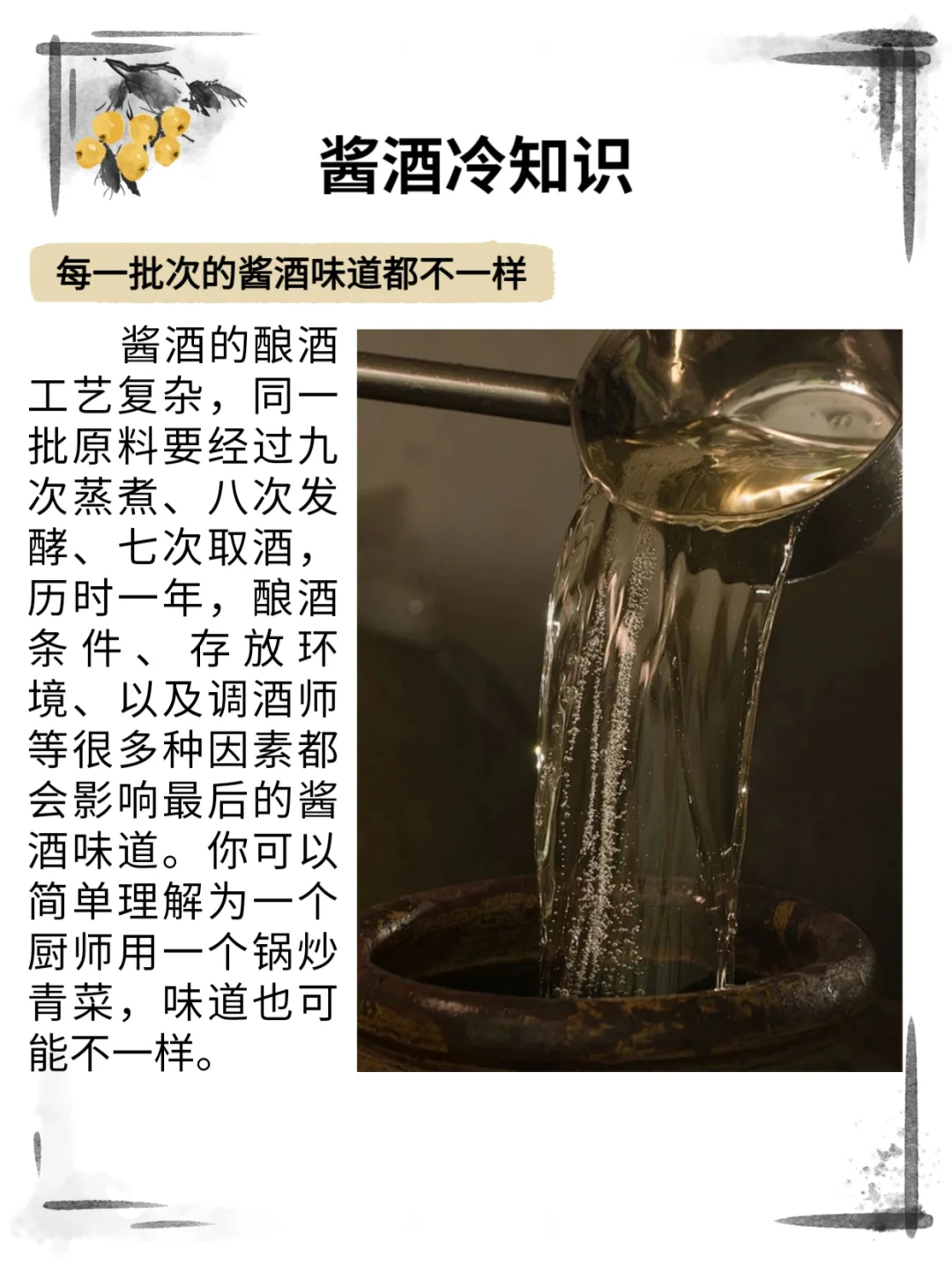 3.每一批次的酱酒味道都不一样 酱酒的酿酒工艺复杂,同一批原料要经过九次蒸煮、八次发酵、七次取酒,历时一年,酿酒条件、存放环境、以及调酒师等很多种因素都会影响最后的酱酒味道。你可以简单理解为一个厨师用一个锅炒青菜,味道也可能不一样。