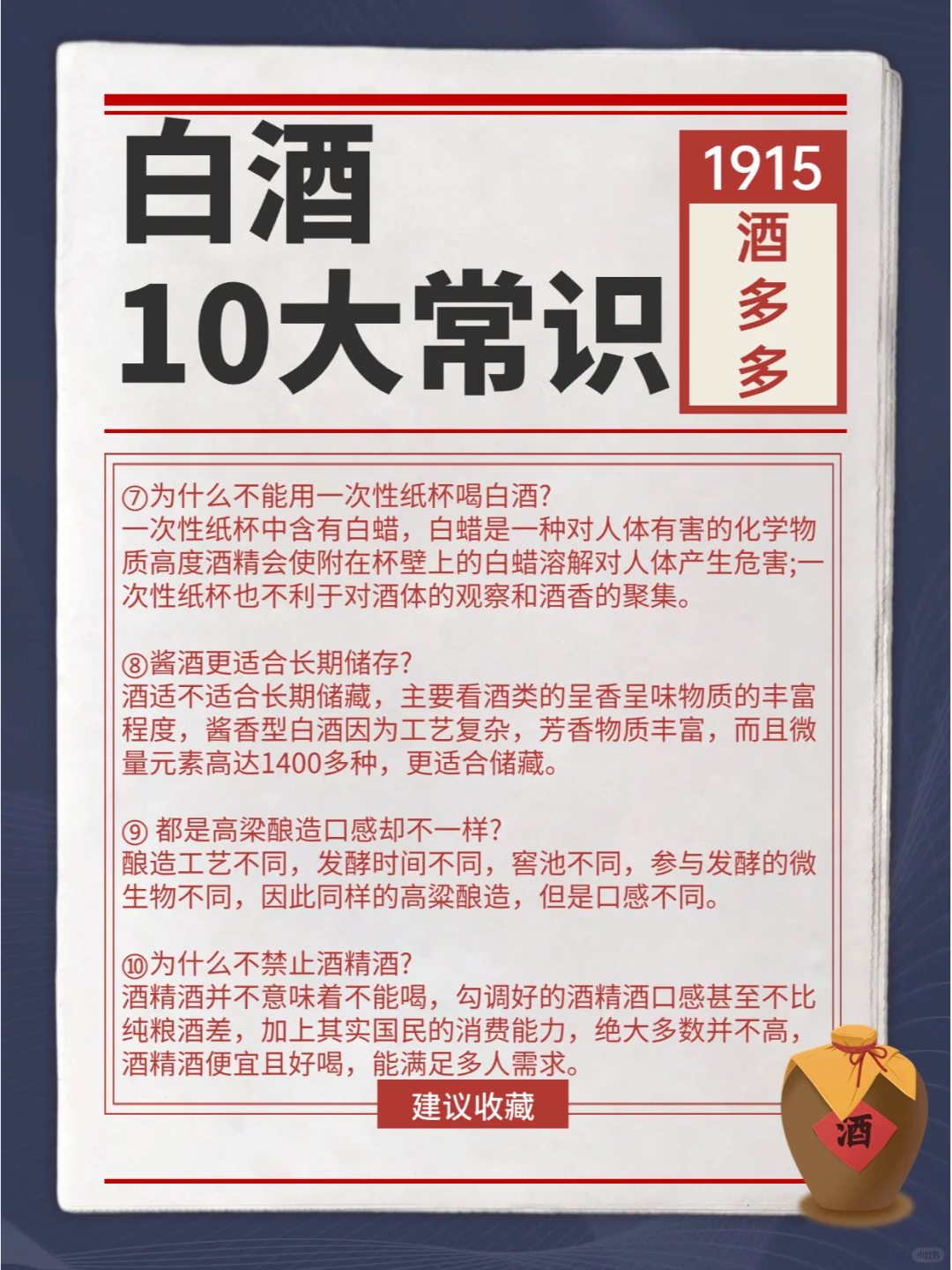 7️⃣ 一次性纸杯为何不宜喝白酒?🪑 一次性纸杯含有的白蜡,是一种对人体有害的化学物质,高度酒精会使白蜡溶解,对人体产生危害。此外,一次性纸杯也不利于观察酒体和聚集酒香。